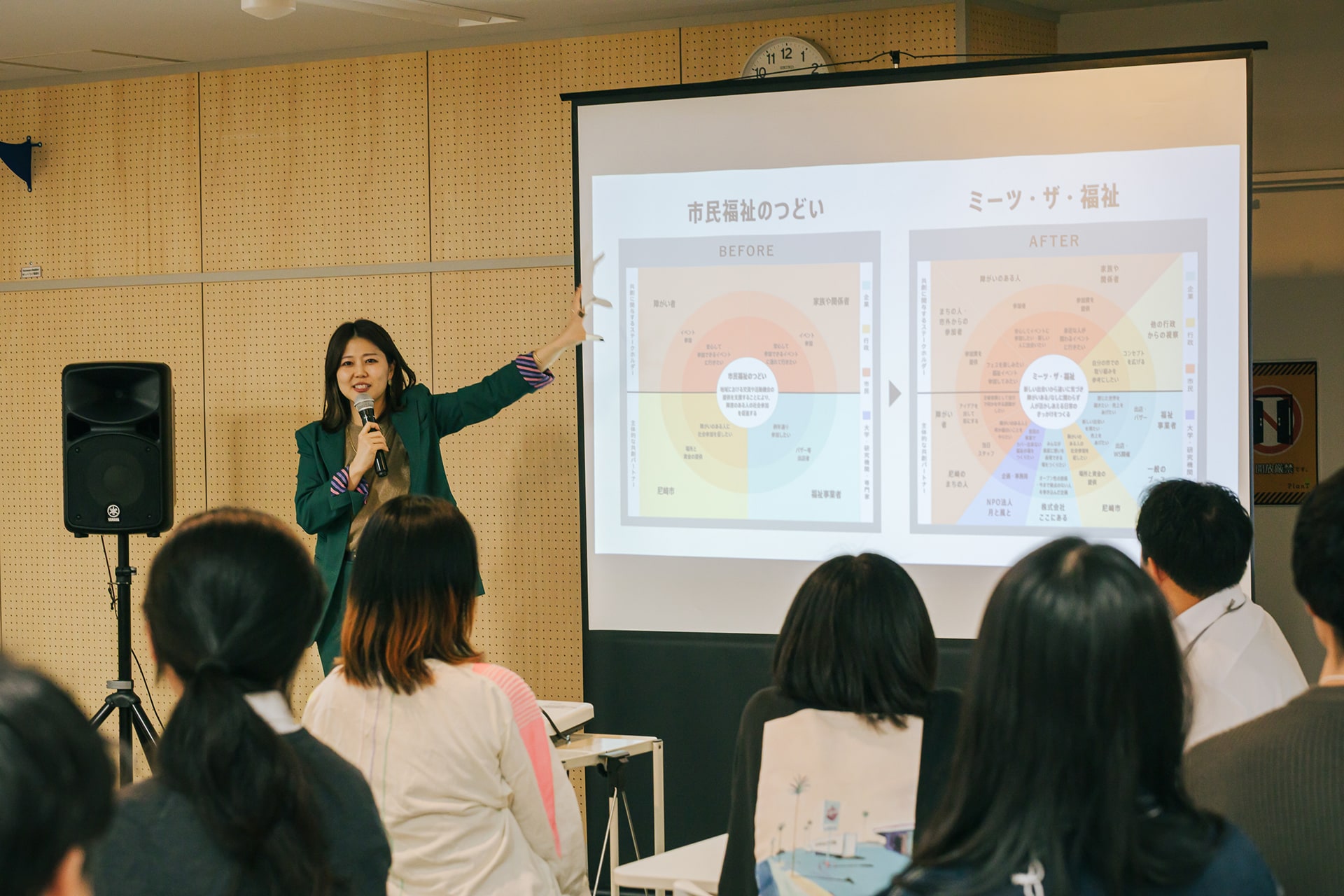 共通の大きな目的のために、誰がどんな役割で何のために関わるのか。パーパスモデルでプロジェクトに関わる人やその領域を視覚的に捉えると、現状を把握しさらに必要なアプローチやプロジェクトの可能性についての発想を広げることができます。吉備氏が紹介した事例「ミーツ・ザ・福祉」は、福祉をテーマに多様な人との出会いを生み出す尼崎市のイベントです。もともと行政主体で行なっていた事業運営を、民間事業者や市民主導型でリニューアルしたもので、当初はサービスの受益者だった障害を抱える人やその家族などもイベントの担い手として参画するようになりました。イベントの参加者はかつての4倍以上になっているといいます(※取材当時)。パーパスモデルを比較すると、関わる人の領域や役割が大きく変化しています。