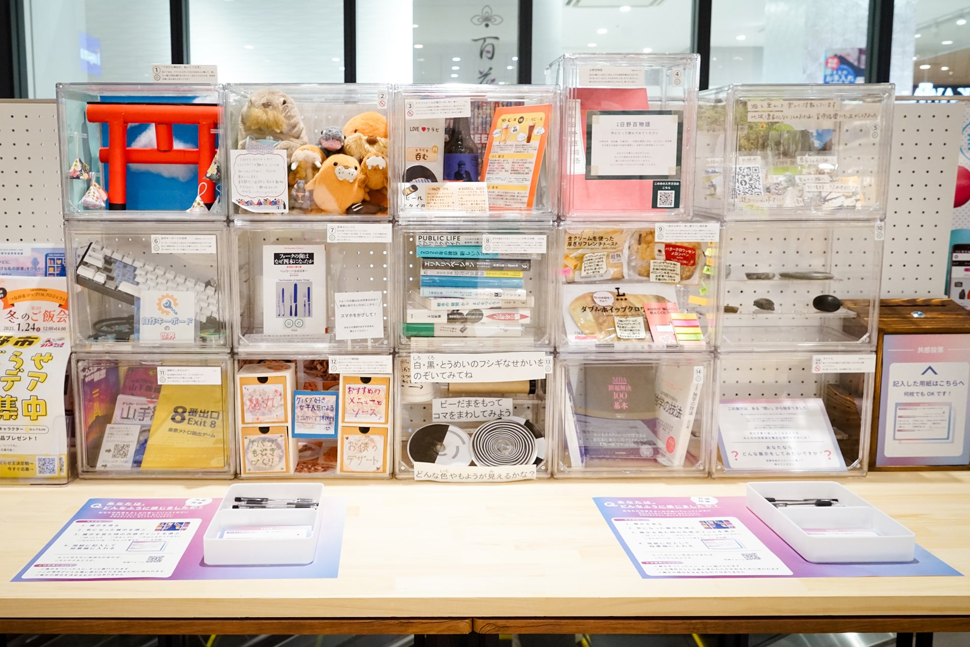 実証実験は2026年1月6日(火)から1月20日(火)まで、イオンモール多摩平の森で実施されました。展示ボックスが設置されたのは2階のエスカレーター横のスペース。14人の展示参加者が持ち寄った“ちいさな私の部屋”は、工作や科学実験、謎解き、パン、クラフトビール、地域活動など、それぞれの関心領域にまつわるアイテムで彩られ、賑やかな空間となりました。