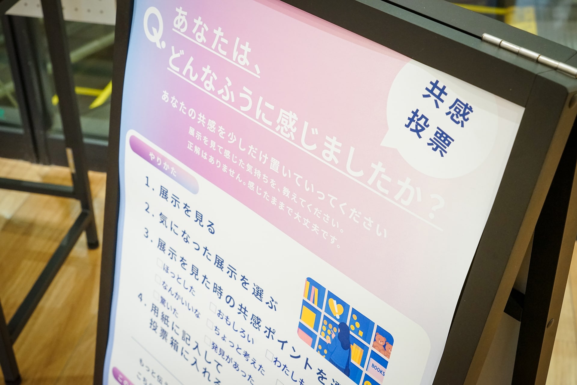 そしてAチームでは、立ち寄って展示を見た人が、気になった展示や共感したポイント、感想などを残せる仕組みとして、展示期間中の「共感投票」を実施。また通りかかった人や立ち止まった人、展示に対して何かしらのリアクションをした人の数を定点測定し、取り組みの効果を検証します。まちで起こっていることに意識を向け、リアクションを残すことで生まれる間接的なコミュニケーションこそ、Aチームが当初思い描いていたゆるやかなつながりです。たくさんのリアクションを期待しつつ、展示がスタートしました。