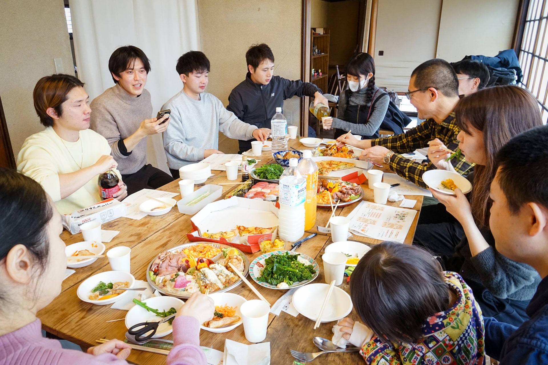 1月に開催されたごはん会には、研修生の個人的なつながりの参加者のほか、2回目のごはん会からのリピーターや、子育て広場のチラシから申し込みをした子ども連れの家族など、小さな子どもから大人までさまざまな参加者が訪れました。テーブルに並んだごはんを食べながら自己紹介をし合い、研修生から妄想実現課やBチームのプロジェクトの説明を聞き、ぽつりぽつりと会話が生まれていきます。
